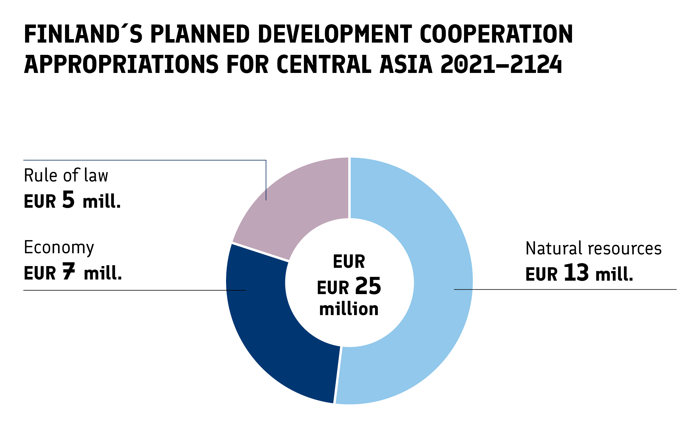 In 2021–2024, Finland's bilateral cooperation in Central Asia will be directed to the development of the rule of law, creation of sustainable economic growth, and improved management of natural resources. The financial frame for Kyrgyzstan, Tajikistan and Uzbekistan in 2021–2024 will be approximately EUR 25 million.